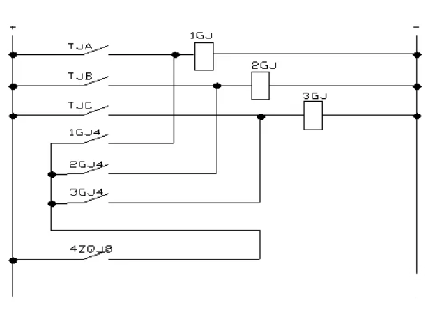 1~3GJ为分相跳闸固定继电器,当分相跳闸继电器TJA、TJB、TJC动作时,其相应的固定继电器动作,且通过自身的触点自保持,实现分相动作固定,由于自保持回路由重合闸启动继电器4ZQJ8触点控制,所以分相动作固定继电器动作后,一直到重合闸起动回路返回时才能返回。原理图如下: