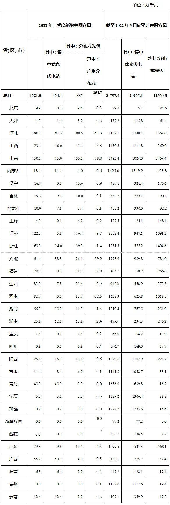 国家能源局发布2022年一季度光伏发电建设运行情况