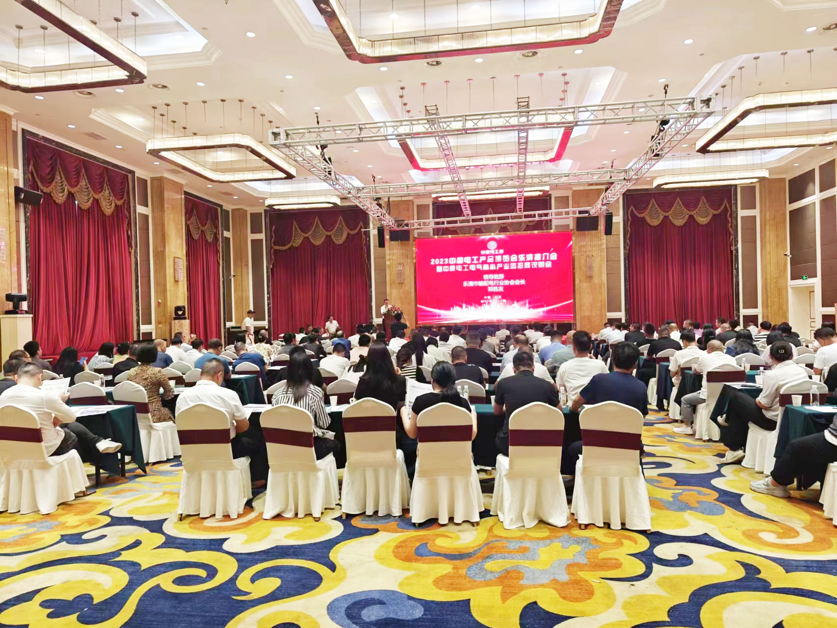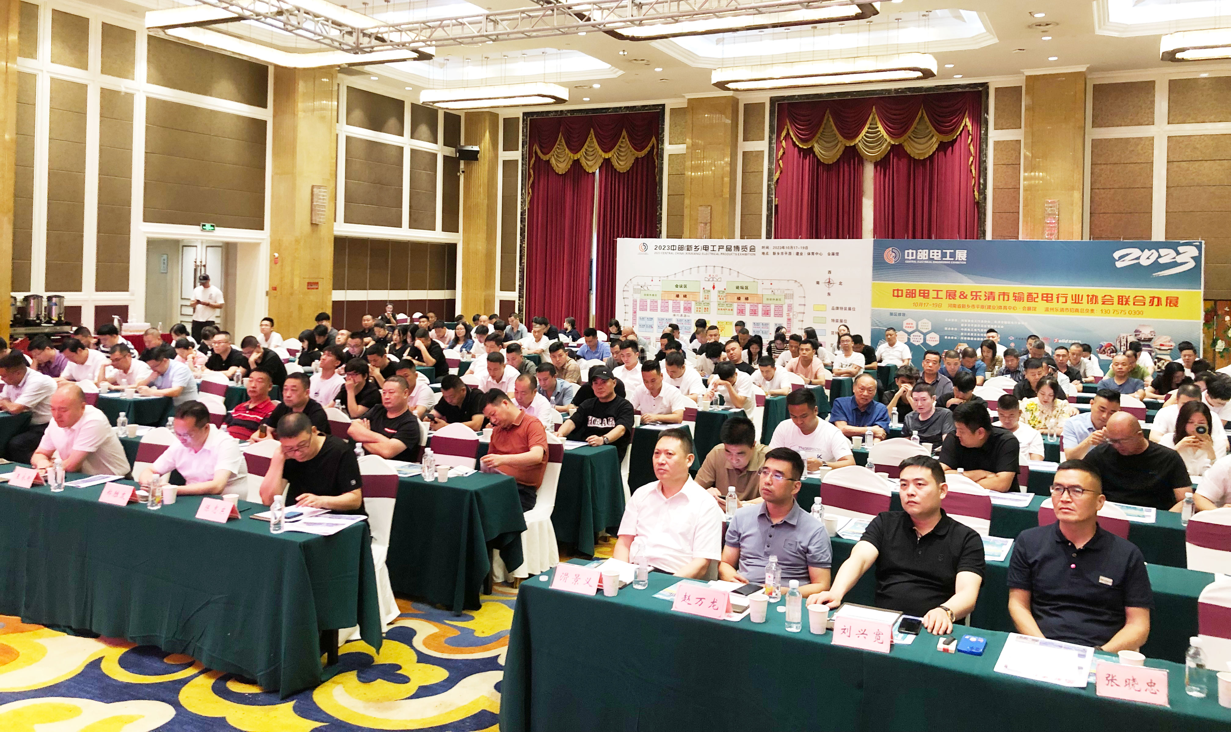 2023年8月17日下午, 河南省电工行业协会联合乐清市输配电行业协会共同组织的2023中部电工产品博览会暨中原电工电气高科产业园招商大会在温州柳市华京大酒店隆重召开。新乡市平原示范区发改局局长刘书成 、市场监管局局长王永刚、河南省电工行业协会秘书长滑景义、河南省温州商会秘书长倪克、中原国创电工电气产业园总经理刘兴宽、乐清市输配电行业协会会长郑胜友、乐清市电线电缆行业协会会长陈志东、温州市河南商会会长李俊、乐清市豫商商会会长赵万龙以及温州柳市的企业代表共200余人参加了本次大会;大会由乐清市输配电行业协会秘书长叶建东主持。