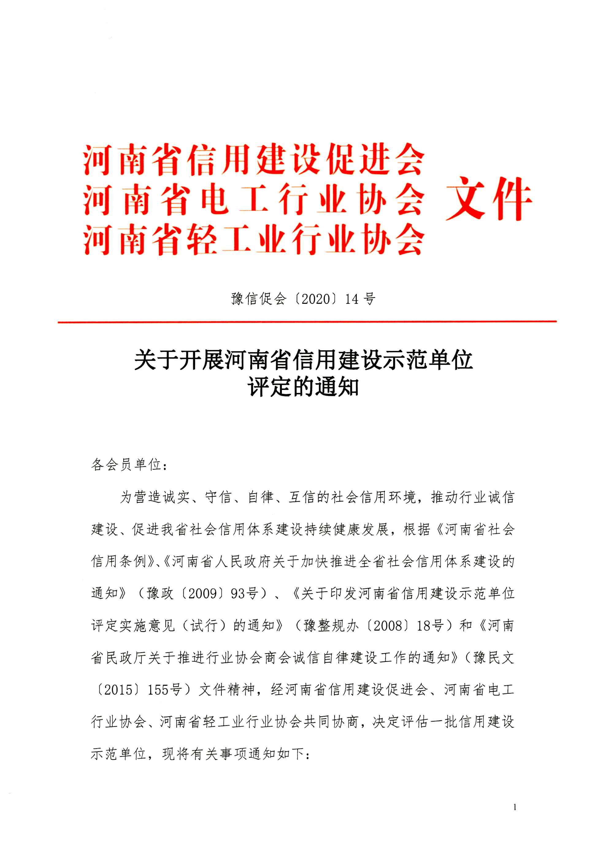 【通知】关于开展河南省信用建设示范单位评定的通知