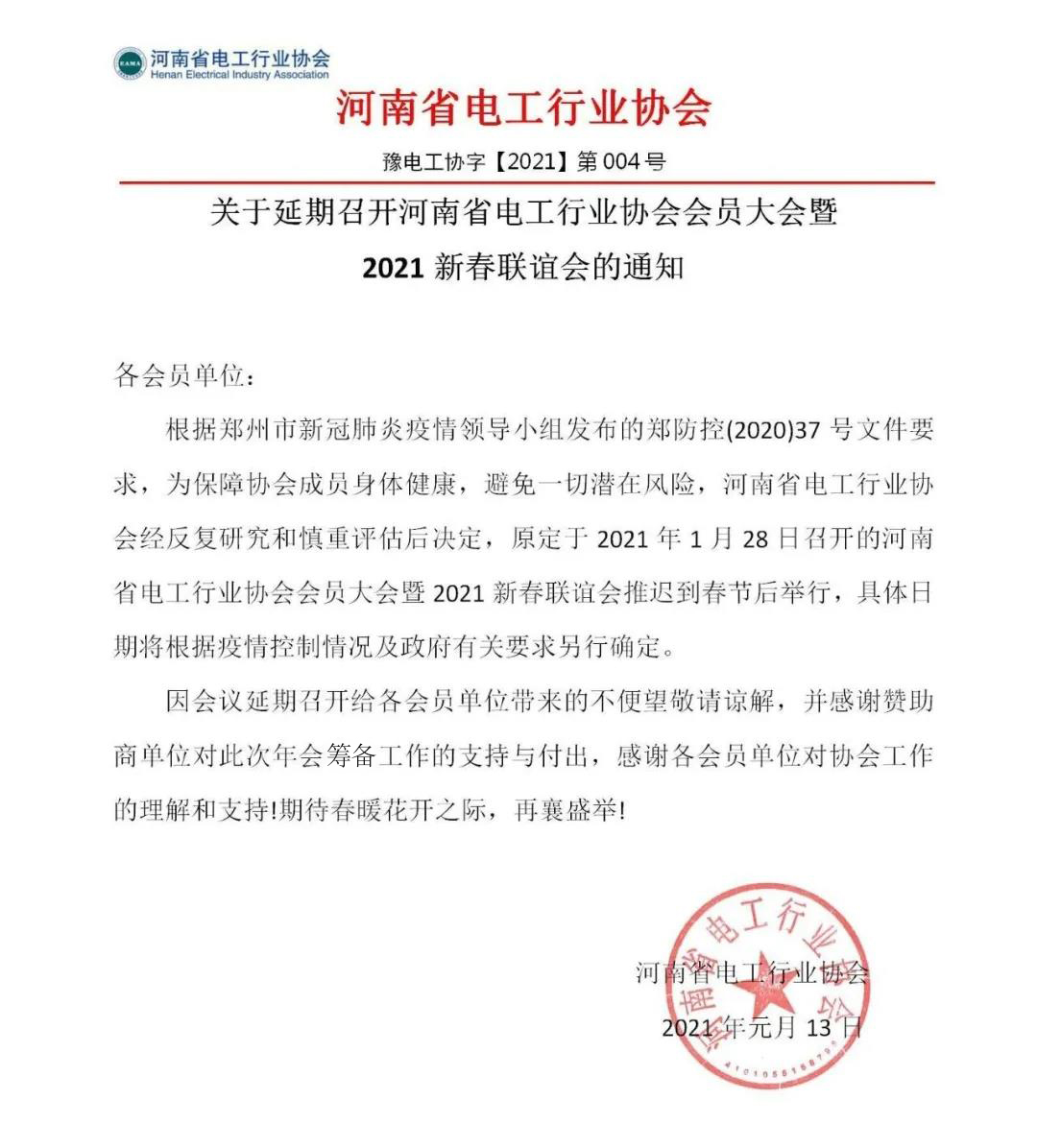 【通知】关于延期召开河南省电工行业协会会员大会暨2021新春联谊会的通知