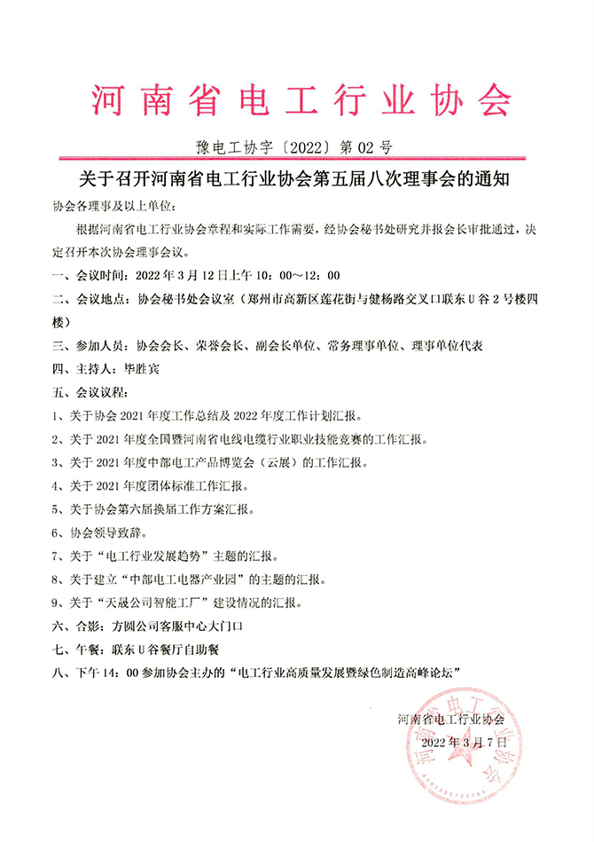 关于召开河南省电工行业协会第五届八次理事会的通知