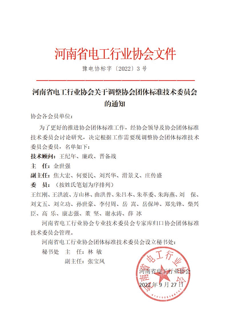 河南省电工行业协会关于调整协会团体标准技术委员会的通知