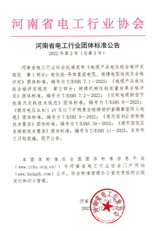 河南省电工行业团体标准公告