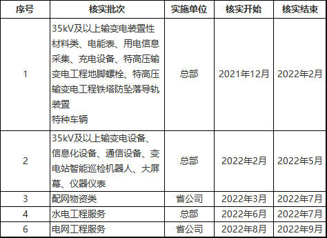 2022年核实工作计划如表1。根据实际情况,核实时间可能有所调整,各批次具体安排将在国家电网有限公司新一代电子商务平台(以下简称“ECP2.0”)提前发布公告,请以相关公告为准。